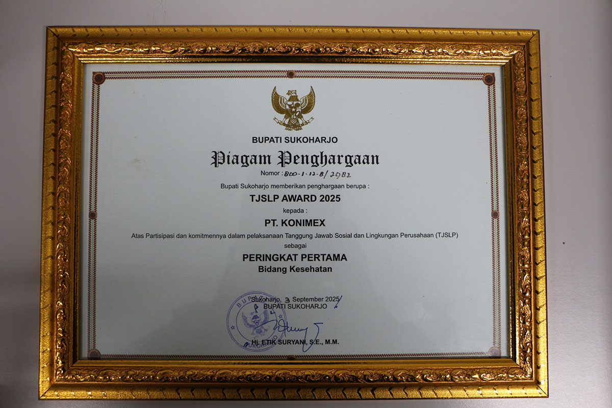 PT Konimex kembali menerima Penghargaan Tanggung Jawab Sosial Lingkungan Perusahaan (TJSLP) atau Corporate Social Responsibility (CSR) Award tahun 2025 dari Pemerintah Kabupaten (pemkab) Sukoharjo sebagai peringkat Pertama Kategori Bidang Kesehatan. Pemberian penghargaan dilaksanakan di Auditorium Gedung Menara Wijaya Lantai 10, Kamis 17 September 2025. Acara ini dihadiri Bupati Sukoharjo Etik Suryani, Forkompimda Kabupaten Sukoharjo, Wakil Bupati Sukoharjo Eko Sapto Purnomo, Sekretaris Daerah Kabupaten Sukoharjo beserta asistennya, Ketua Apindo Sukoharjo, dsb.